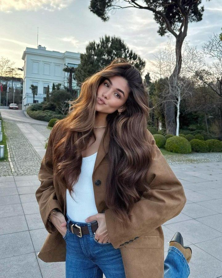 Renk ile kombinlendiğinde ise uzun kesitler adeta yeni bir kimlik kazanıyor. 2025’te karamel ışıltılar, soğuk kahveler ve doğal geçişli balyajlar, uzun saç bölümlerini tamamlayan en tanınan tercihler ortasında.