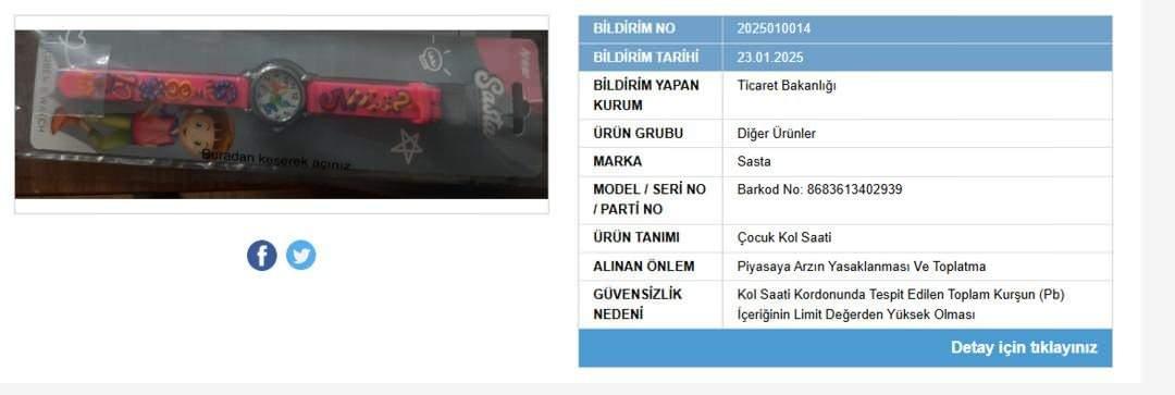 Son olarak “Sasta” marka çocuk saatlerinin yüksek ölçüde kurşun içermesi nedeniyle piyasadan toplatılmasına karar veren bakanlık, 2 çocuk eseriyle ilgili de yasak kararı aldı. Yapılan açıklamada “Kol saati kordonunda tespit edilen toplam kurşun (Pb) içeriğinin limit pahadan yüksek olması” münasebet gösterildi.