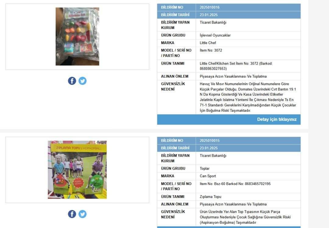 Ticaret Bakanlığı tarafından yapılan denetlemelere nazaran, 3 çocuk eserinin daha piyasadan toplatılmasına karar verdi. ‘Güvensiz ürünler’ listesinde yer alan çocuk kol saati, zıplama topu ve mutfak oyun setinde ölümcül risk bulunduğu tespit edildi.
