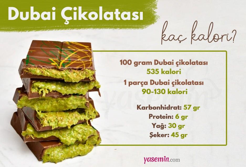Diyetisyen Şükriye Eral, son vakitlerde tanınan olan 100 gramlık Dubai çikolatasında yaklaşık 500 kalori olduğunu belirterek, “Bu kaloriye yakabilmek için ortalama 1 saat civarında yürüyüş, süratli tempolu spor yapmamız gerekiyor” dedi.