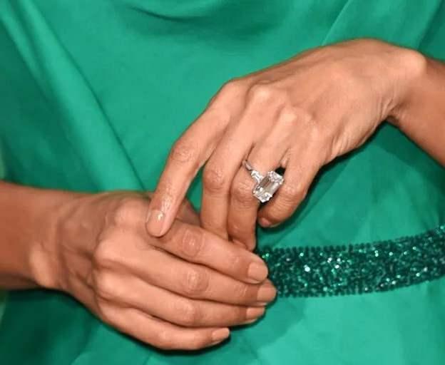 12 karatlık yüzük, baget kesim ve etrafı taşlarla çevrili. InStyle’ın haberine nazaran; yüzüğün bedelinin 250.000 dolar olduğu iddia ediliyor.