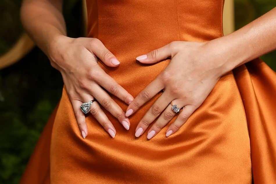 Göz alıcı turuncu tonlarında Louis Vuitton bir elbise giyen ünlü yıldızın parmağındaki büyük elmas yüzük, hayranlarını heyecanlandırdı. 5.02 karatlık yüzük, İngiliz kuyumcu Jessica McCormack’in imzasını taşıyor ve 18 ayar beyaz altın ve sarı altından oluşuyor.
