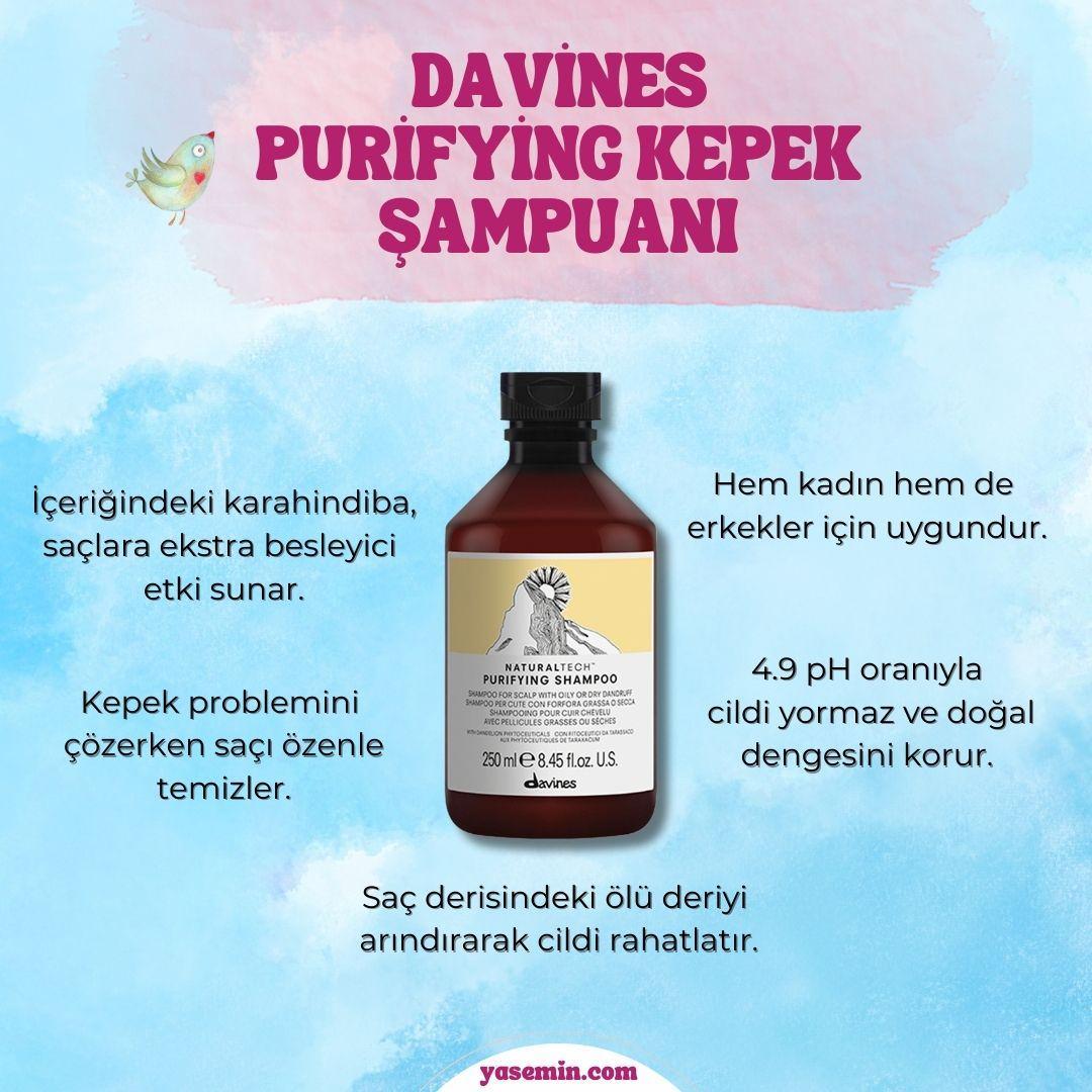 Davines Purifying Kepeğe Karşı Şampuan, içeriğinde bulunan karahindiba, saçı besliyor ve ve güç katıyor. Saçın doğal yapısını bozmadan nazik bileşenlerle paklık sağlıyor. Şampuandaki lavanta, saç derisini meyyit hücrelerden arındırıyor ve saçın daha sağlıklı uzamasını sağlıyor. Adaçayı ise saç derisini rahatlatıyor. 4.9 pH oranıyla cildi yormaz ve doğal istikrarını koruyan bu şampuan, kepek sorunu yaşayan saçlar için önerilen tesirli bir tahlildir.