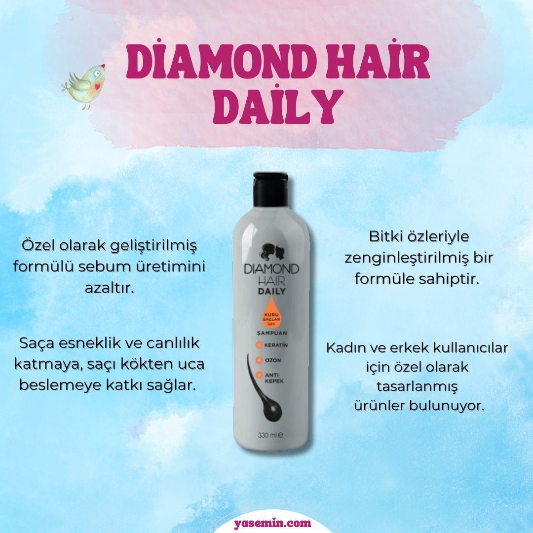 Diamond Hair Daily şampuan, kadın ve erkek kullanıcılar için özel olarak tasarlanmış eserler bulunuyor. Her bir eser, saç tipine uygun olarak üç başka kümeye ayrılan bu şampuanlar bitki özleriyle zenginleştirilmiş bir formüle sahiptir. saçlarınızın doğal nem istikrarını koruyan Diamond Hair Daily şampuan, kepek oluşumunu da engellerler. Ayrıyeten, saç derisini rahatlatır ve saçlarınızın daha sağlıklı ve parlak görünmesini sağlar.