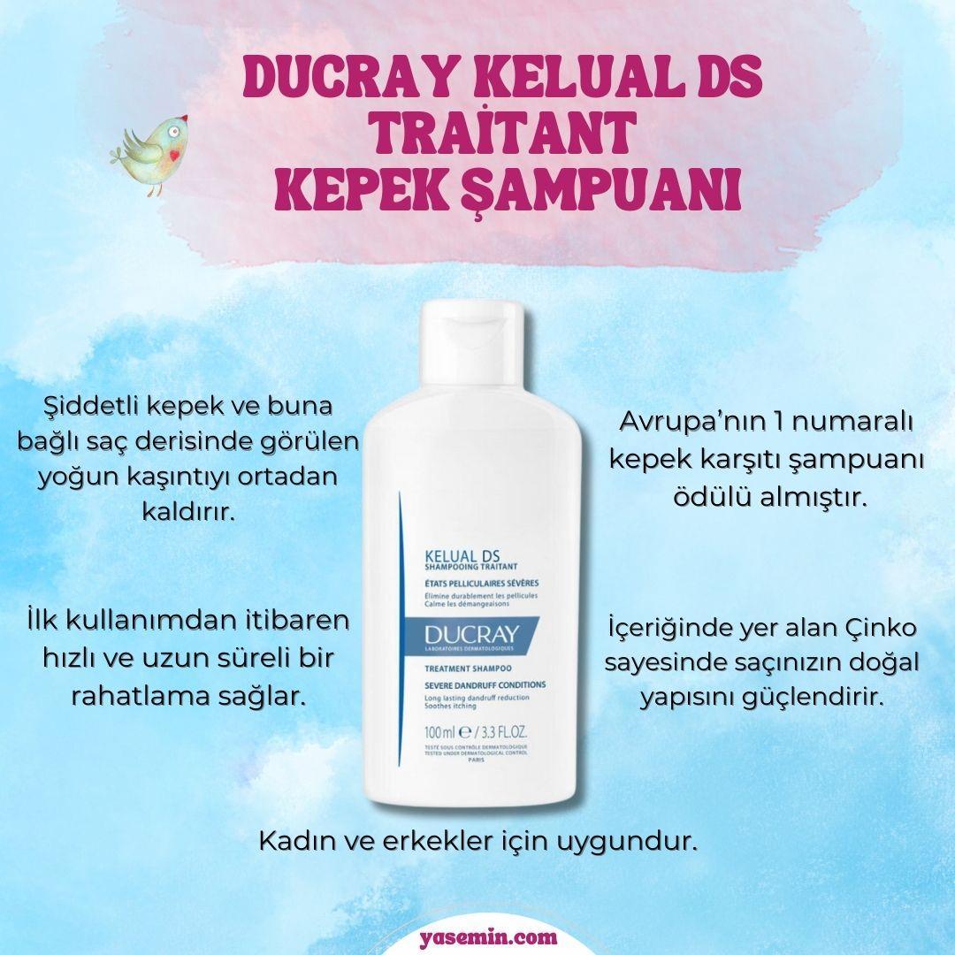 Avrupa’nın 1 numaralı kepek aksisi şampuanı Ducray Kelual DS, şiddetli kepek ve buna bağlı saç derisinde görülen ağır kaşıntı durumlarında kullanabileceğiniz bir eserdir. içeriğindeki etkin bileşenler sayesinde kepek görünümünü yüzde 89, kaşıntı hissini yüzde 80 oranında azaltmaya yardımcı olan bu şampuan, içeriğinde yer alan Çinko sayesinde saçınızın doğal yapısını güçlendirirken, nemlenmesini ve yatışmasını sağlar. Kelual Ds, tesirli sonuç için 6 hafta müddetle haftada 2 defa uygulama öneriyor.