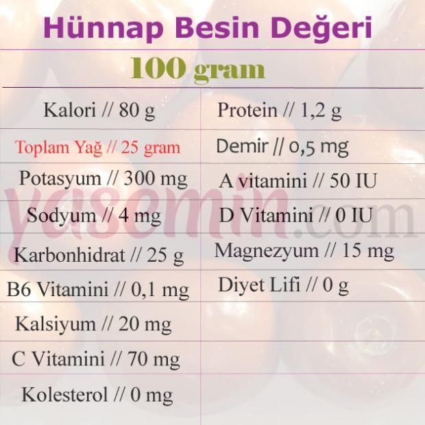 İçeriğinde yüzde 85 oranda C vitamini bulunduran ender meyvelerdendir. Bu özelliği sayesinde bir avucu tüm bedeni toksinlerden arındırır. Bağışıklığı güçlendirir. 100 gramlık hünnapta yüzde 7 A vitamini, yüzde 20 B vitamini ayrıyeten demir, manganez, magnezyum, fosfor, kalsiyum, çinko ve sodyum bulunuyor. Hünnapla ilgili yapılan çalışmalarda meyvenin kanserli hücrelerin oluşumunu azalttığı biliniyor. Güçlü bir içeriğe sahip olan hünnap meyvesi doğal bir sakinleştirici özelliği vardır. Ayrıyeten alternatif tıp uzmanlarının tekliflerine nazaran Hünnap kandaki iltihabı temizliyor. Karaciğer ve kalbin daha işlevli çalışmasını destekliyor.