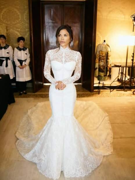 Dolce & Gabbana imzalı, yüksek yakalı, uzun kollu, korseli ve ipek düğmeli gösterişli bir gelinlik tercih eden Sanchez’in gelinliğinin hazırlanması tamı tamına 900 saat sürdü.