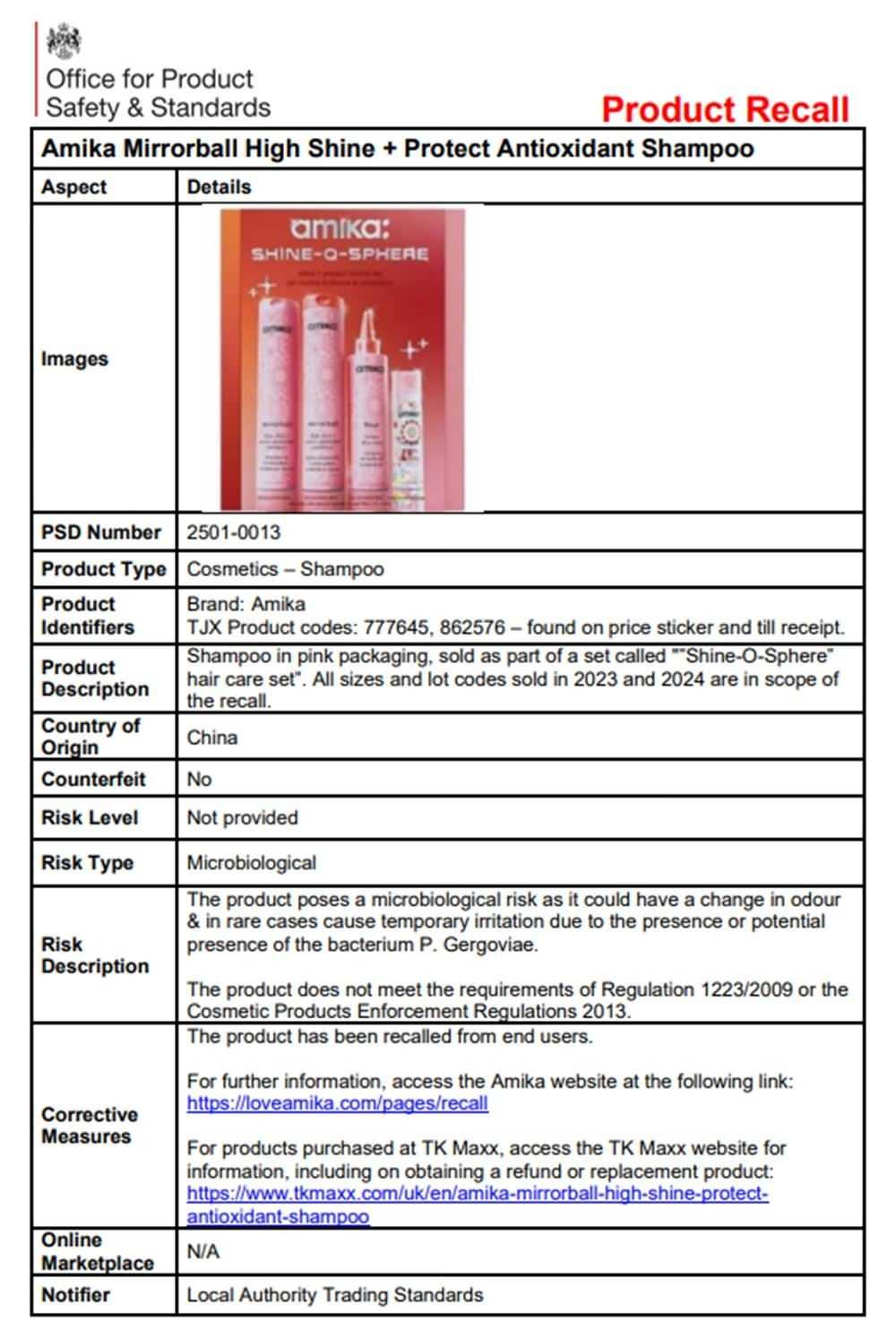 Denbighshire Ticaret Standartları isimli X hesabının paylaşımına nazaran, eserlerde Pluralibacter gergoviae bakterisinin bulunduğunu tespit ettikten sonra, marka 980 binden fazla sayıda bulunan mirrorball high shine ve müdafaa şampuanlarını geri çağırma kararı aldı.