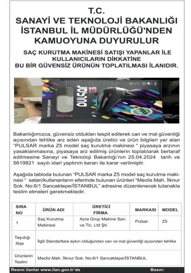 “Bakanlığımızca, inançsız oldukları tespit edilerek can ve mal güvenliği açısından tehlike arz eden aşağıda üretici ve eser bilgileri yer alan ‘PULSAR marka Z5 model saç kurutma makinesi’ piyasaya arzının yasaklanmasına, piyasaya arz edilmiş eserlerin toplatılarak bertaraf edilmesine Sanayi ve Teknoloji Bakanlığı’nın 25.04.2024 tarih ve 5619821 sayılı idari yaptırım kararı ile karar verilmiştir.