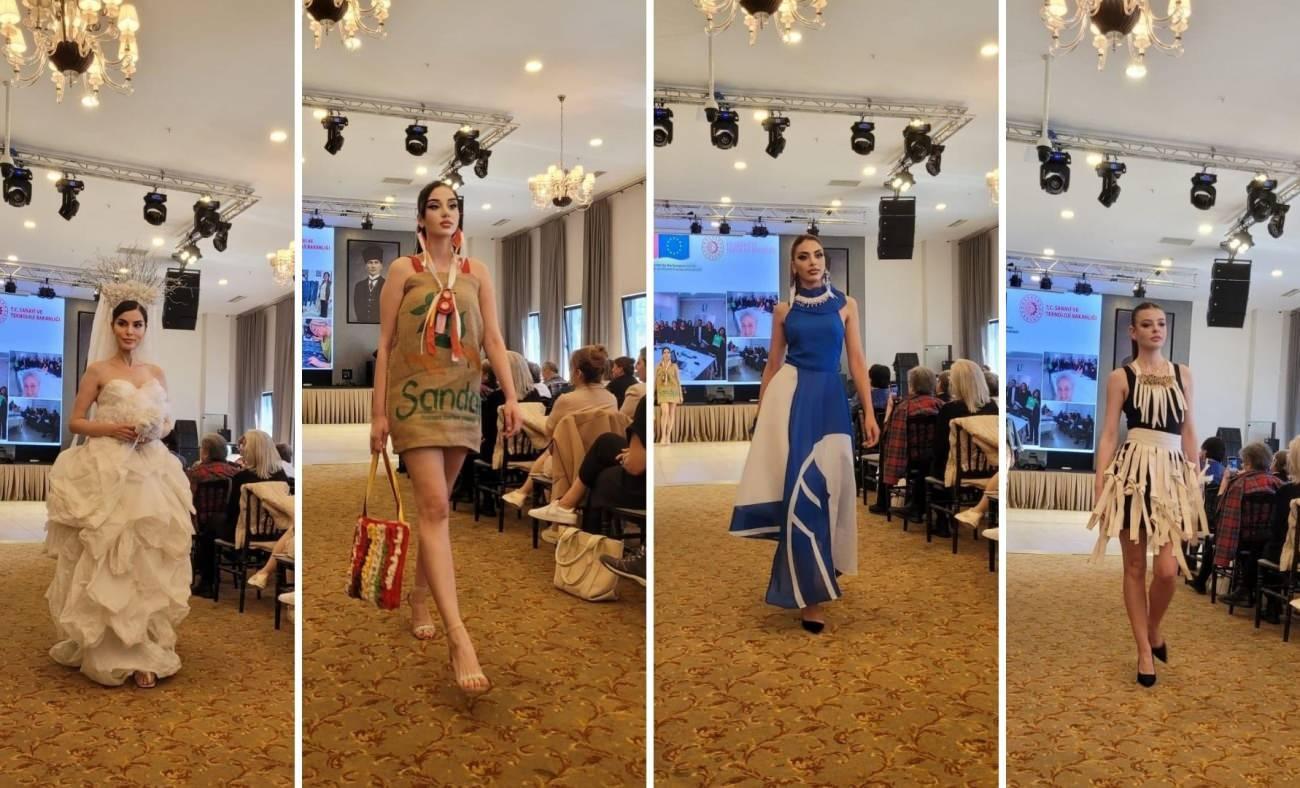 Ezber bozan defilede, çanta saplarının büstiyere, eteğe dönüşmesi, sandıkta kalan dantellerin farklı formlarda hayat bulması, fermuar düğme atıklarından üretilen takılarla zenginleşen kıyafetlerin tecrübeli modeller tarafından taşınması bayan kooperatiflerinin gücünün hafife alınmamasını ispatlar niteliğindeydi.